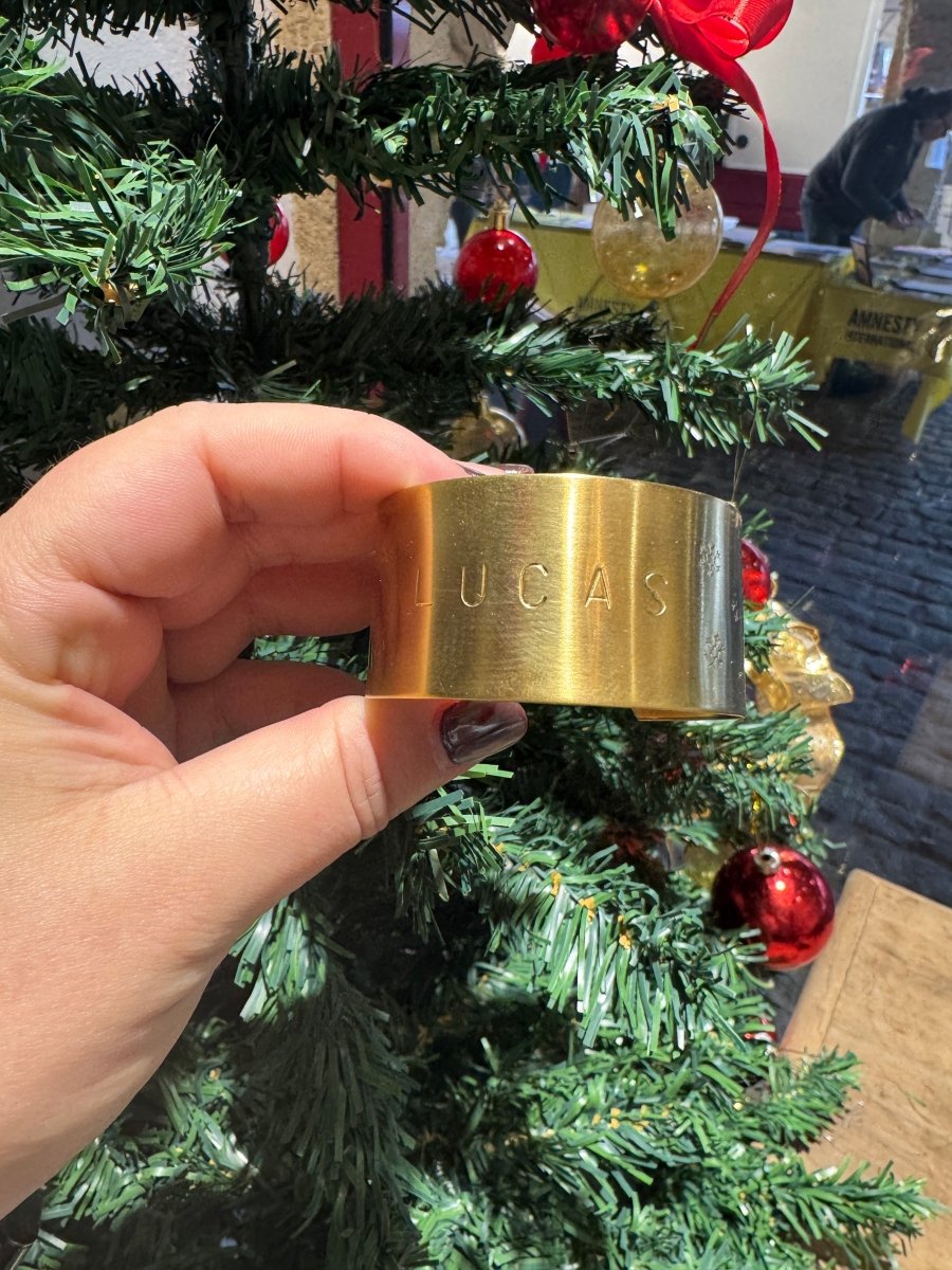 Rond de serviette en laiton travaillé à la main par estampillage artisanal. Chaque pièce est unique, gravée selon vos souhaits pour personnaliser votre table avec élégance. Largeur 3 cm. Livré dans un pochon en coton, parfait pour offrir ou conserver. Un accessoire de table raffiné qui allie tradition et sur-mesure.