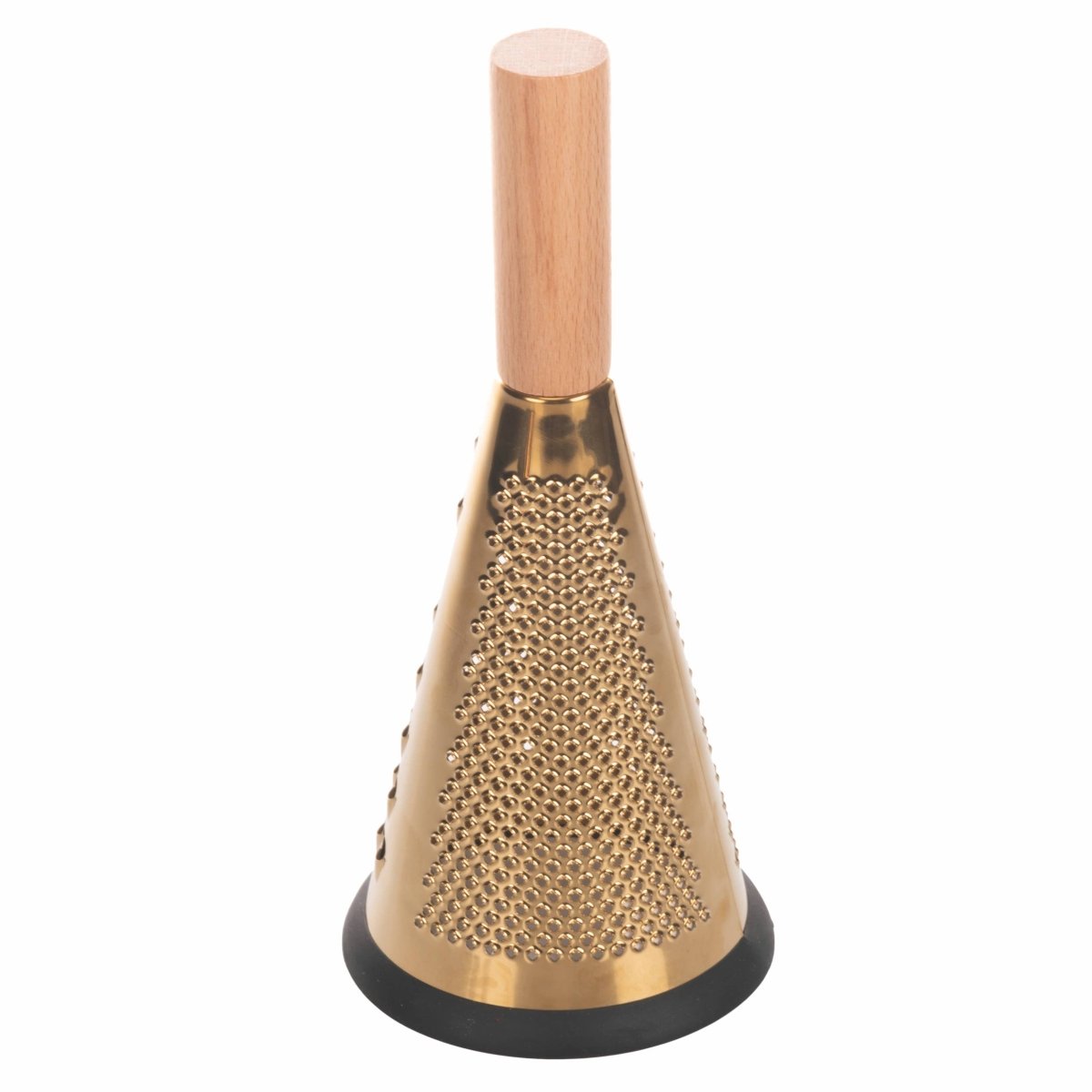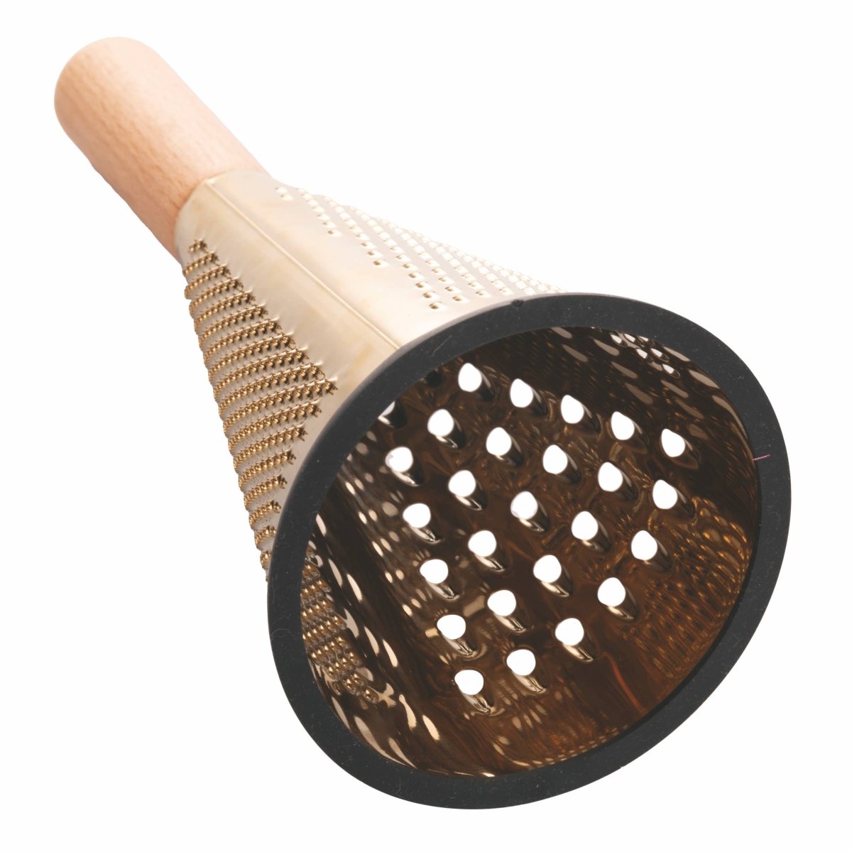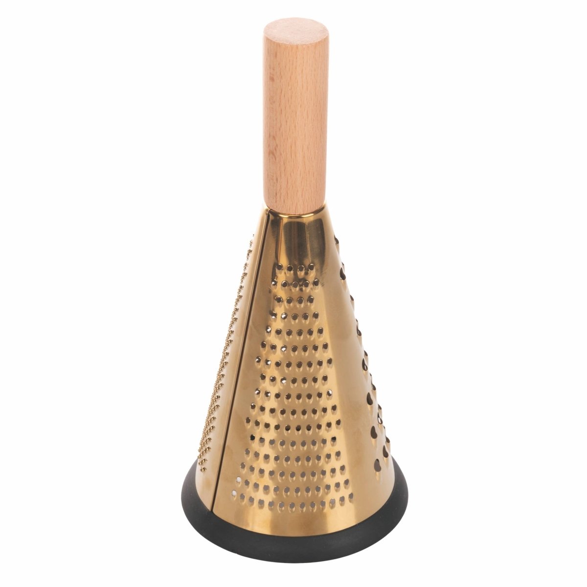 Râpe multifonction en bois Lames en acier inoxydable 430 Manche en bois de hêtre Base antidérapante en caoutchouc TPR 3 types de râpage : - râpe à gros grains - râpe à grains moyens - râpe à grains fins Idéale pour râper fromage, légumes, chocolat et autres épices solides Dimensions : Ø 11,5 x h. 23 cm Compatible lave-vaisselle Couleur : doré et bois naturel