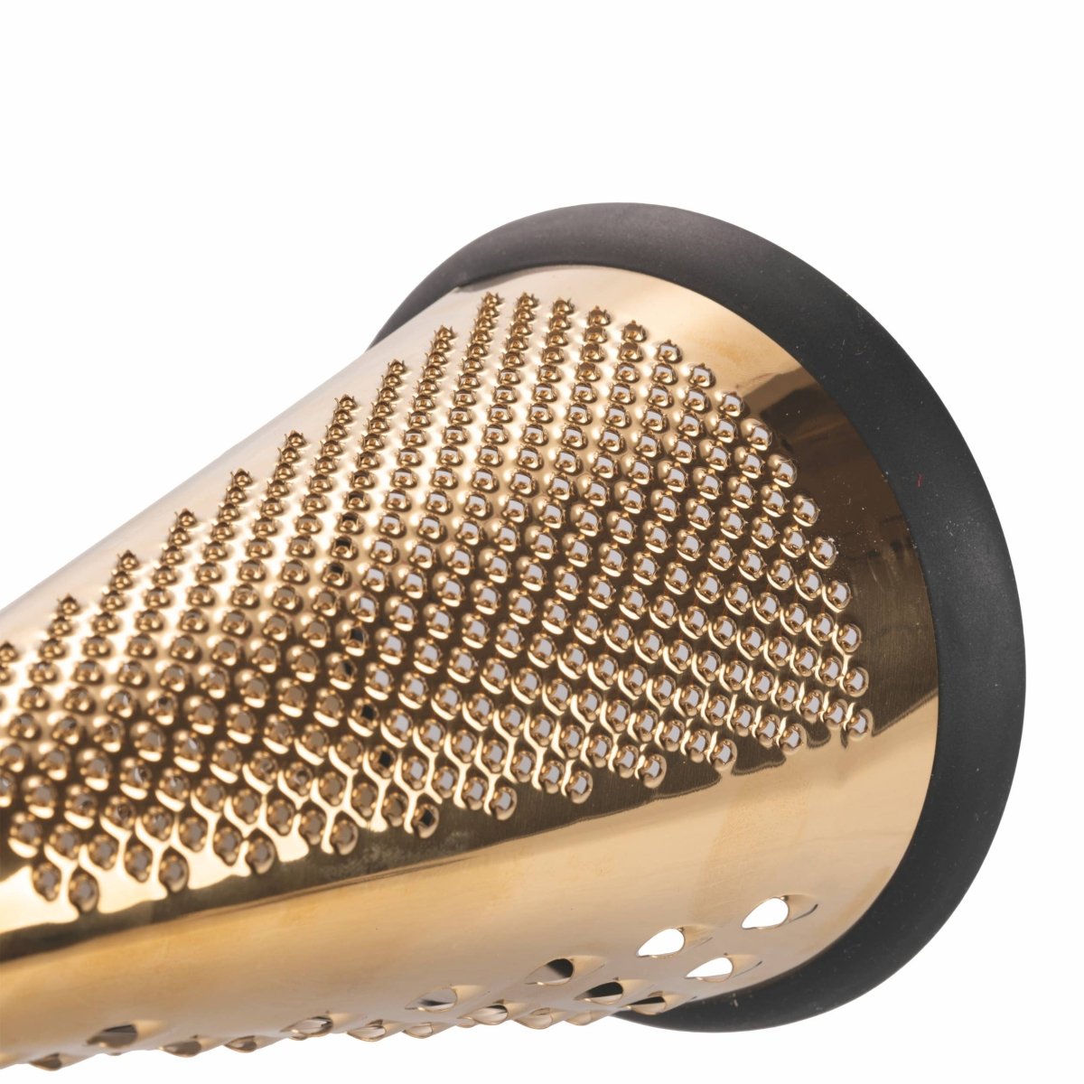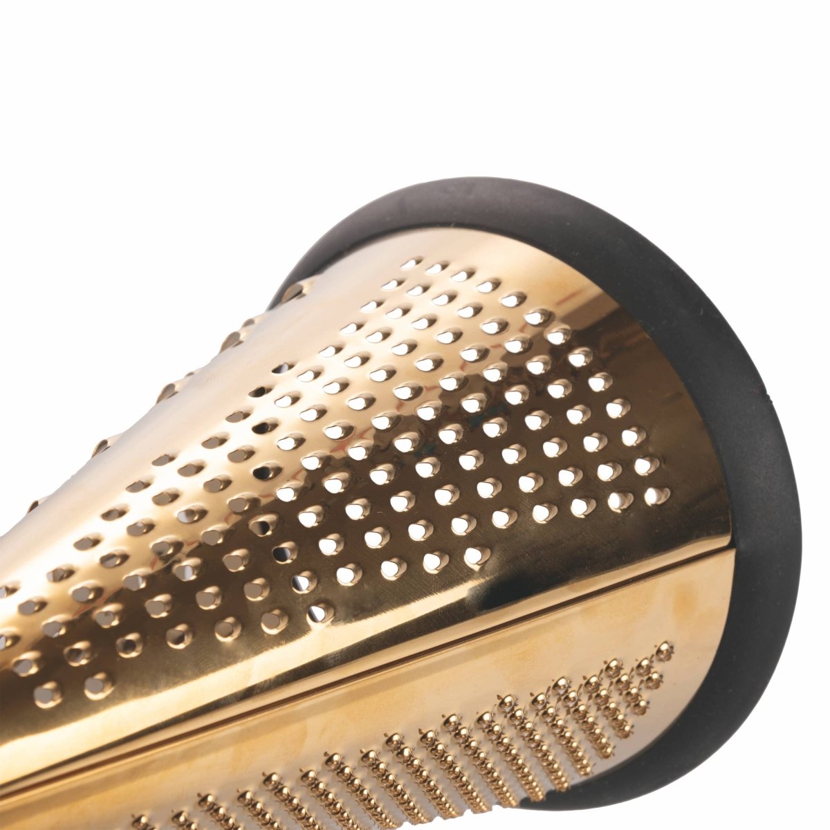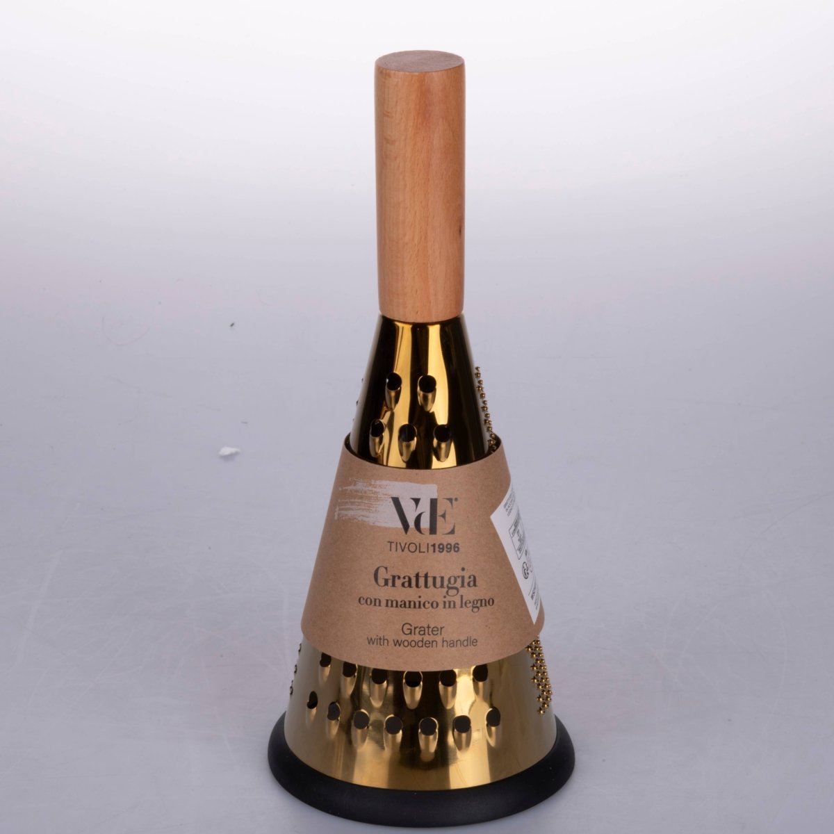 Râpe multifonction en bois Lames en acier inoxydable 430 Manche en bois de hêtre Base antidérapante en caoutchouc TPR 3 types de râpage : - râpe à gros grains - râpe à grains moyens - râpe à grains fins Idéale pour râper fromage, légumes, chocolat et autres épices solides Dimensions : Ø 11,5 x h. 23 cm Compatible lave-vaisselle Couleur : doré et bois naturel